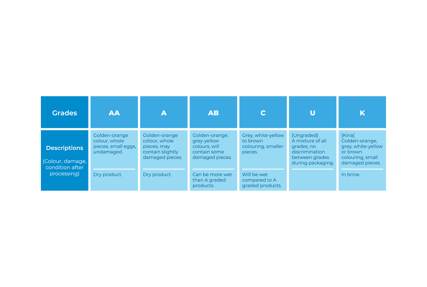 How do we grade sea urchins? Our product is graded into six different categories as shown in this chart. The processing team are meticulous when it comes to our Uni & Kina quality. Our regular customers are able to choose between these grades depending on their needs.